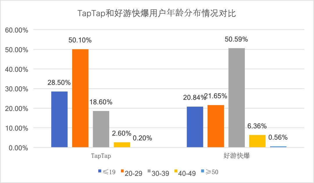 (2) 用户年龄分布情况:相比于TapTap,好游快爆用户平均年龄偏大,30-39岁用户占比最高,超过50%