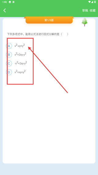 2、切换到学页,做数学因式分解题,巩固知识,完成后查看解析,提升解题能力,点击选择。