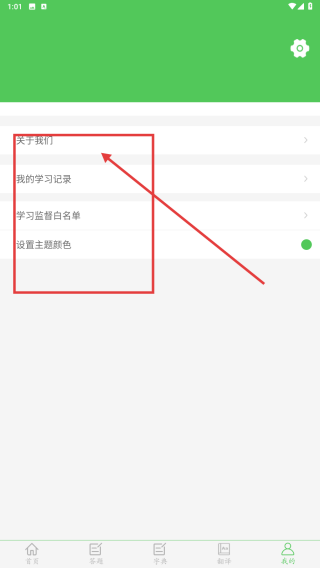 3、打开我的页面,进入设置,查看学习记录、设置主题颜色等,个性化管理学习应用。