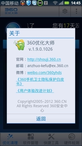 360优化大师的界面设计简洁明了,“手机加速”功能位于最醒目的位置。点击该功能后,软件会自动启动扫描程序。扫描完成后的数据显示,系统中待深度清理的垃圾文件接近100M,这些垃圾主要来源于新浪微博的缓存数据和UC浏览器的使用记录。