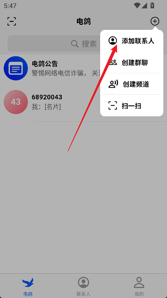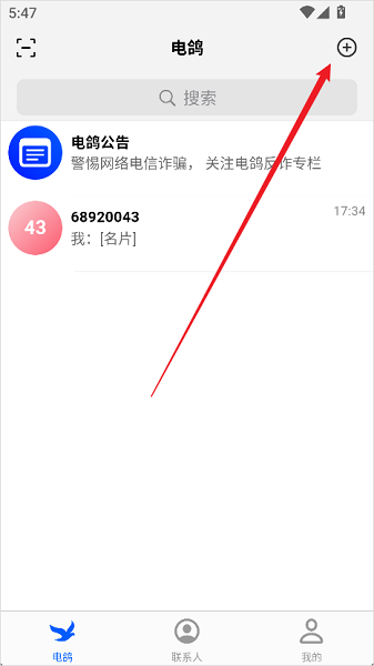 1、打开电鸽App主界面,点击右上角的“+”图标,进入功能选项栏。