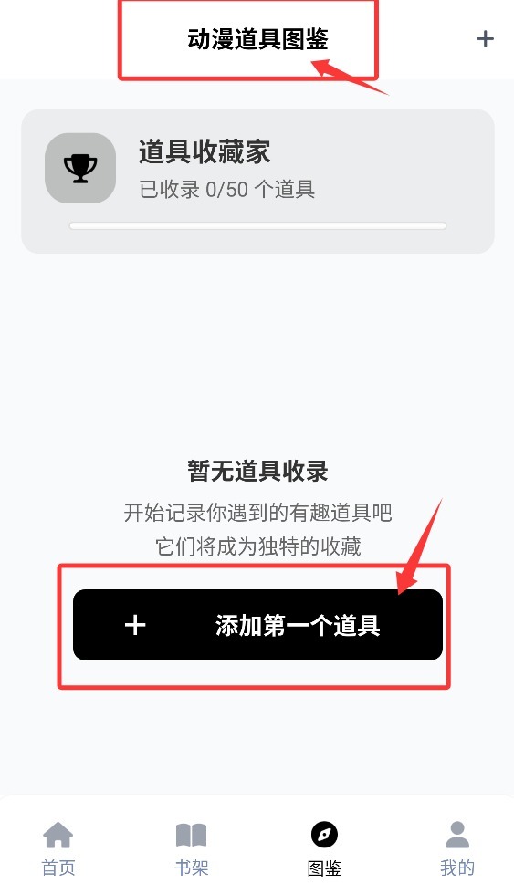 4、在动漫道具图鉴中可手动添加第一个道具卡片,记录其名称、出处与特殊功能信息。