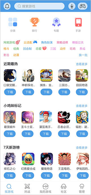 1、第一步是打开软件并进入找游戏页面,这里提供了丰富多样的游戏类型供你选择,你也能够借助搜索功能找到自己想要的游戏。