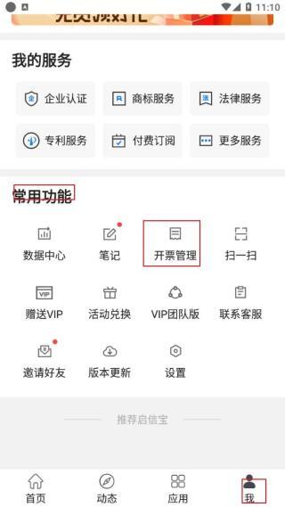 1、首先在本站下载并安装企信宝官网版,打开应用并完成登录,然后在“我”的板块里,从常用功能中找到开票管理。