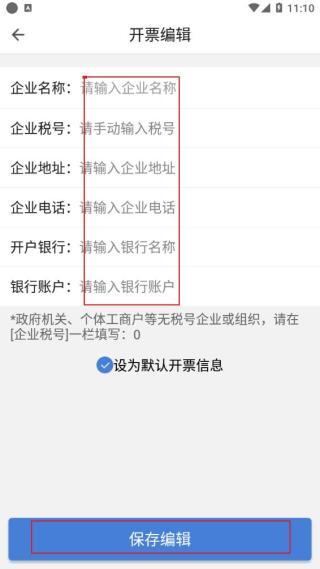 3、准确录入企业名称、税号、地址、电话及账户信息,完成后保存编辑内容。