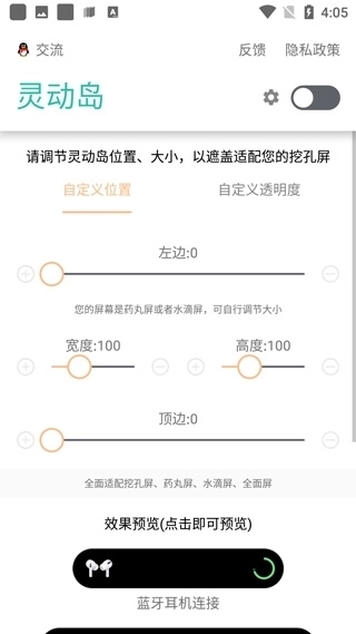 屏幕适配:根据你的手机型号,选择前置摄像头的位置(居中或左侧),让岛屿精确匹配挖孔区域。