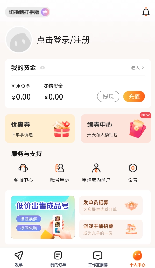 1、若用户初始选择的是打手版,进入软件后,点击右下角的个人中心,接着点击左上角的切换按钮,即可切换至号主版。