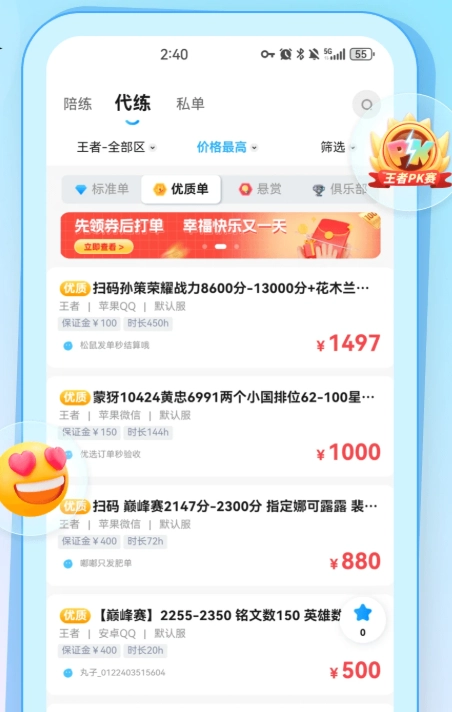 2. 代练服务:用户既能在此平台找到专业代练玩家助力提升游戏分数,也可利用空闲时间承接代练订单,轻松获取收益。