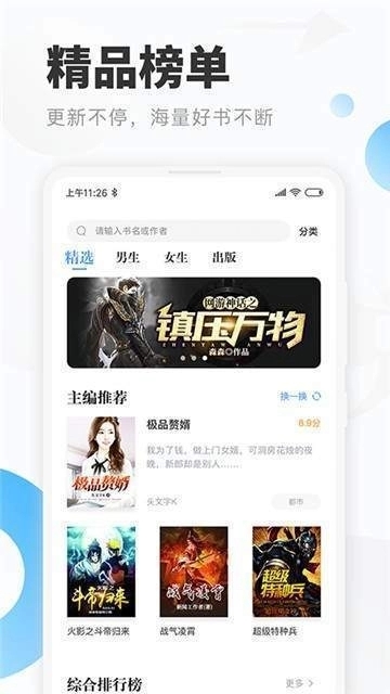 首页推荐:编辑精选、热门完本、新书速递、猜你喜欢(基于阅读历史推荐)。