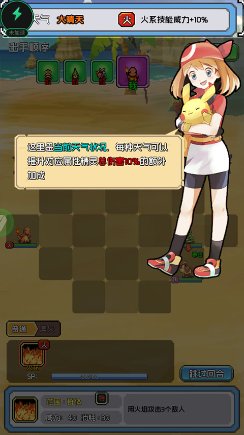 9、并且上方还会显示当前天气状况,每种天气可以提升对应属性精灵总伤害10%的额外加成