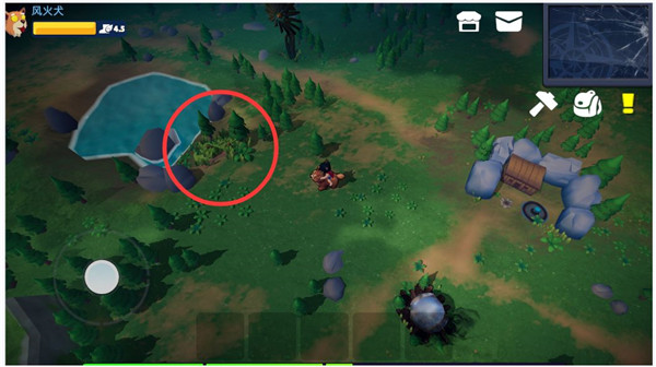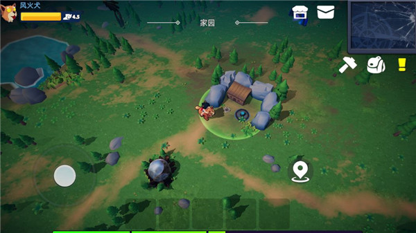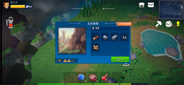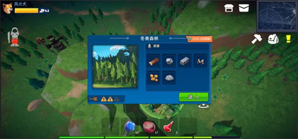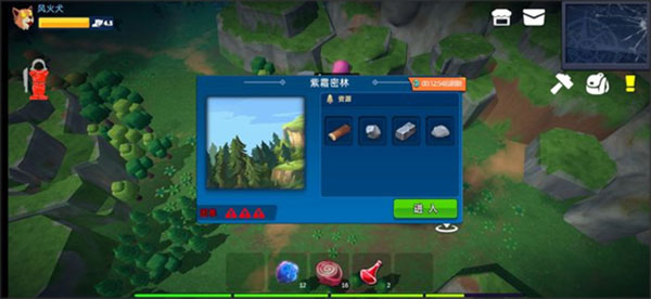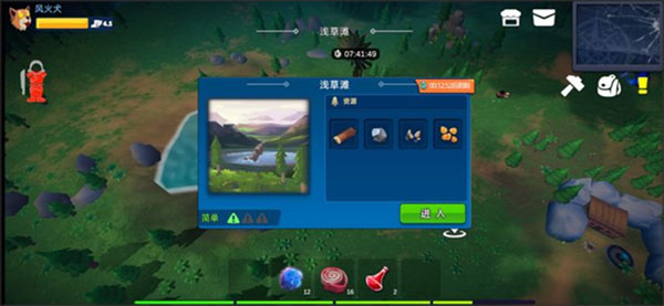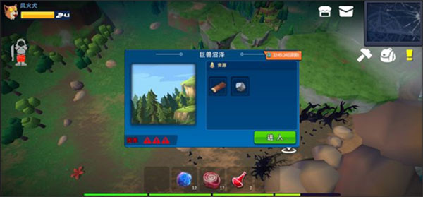 6、现在大家就可以穿上衣服拿上武器出去打怪(捡垃圾)了。这里给大家科普一下大概的地图的布局,一开始新手最好是去左边这个浅草滩的地图,怪物等级低,难度不高,如果被打可以直接吃红果子回血,前期升级快,很快就可以到达5+级,之后大家可以回家造一点储物箱,把东西都储存一下,然后去右边的这个小树林,这里的怪物比较厉害,大家要小心一点,尽量步步为营,当物资装备比较齐全后,大家可以去家园的左上,有一个叫石坑的地图,这里面石矿和铁矿较多,但是怪物攻击较高,大伙也要小心对待。