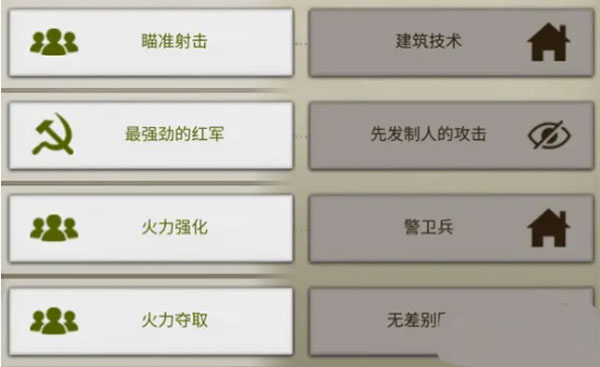 作战方式要么是纯粹的人海战术,要么是低成本的装甲海战术。一费的动员兵主要作用在于换牌,小型精炼所同理。进攻时主要依靠五费的枪榴弹来拆除敌方基地,补给车为多人部队补充兵员。使用“为了祖国”技能能暂时消除士气低落状态。若对面采用人海战术,就派出双人班狙击手,由于是双人班,卡车也可为其补充人员。 我采用的人海战术是先发制人,搭配“乌拉 + IS2”。科技树全部点第一列,包括游击队、近卫军、近卫军7人队、喷火兵、反坦克枪、双人狙击手(女狙也行)、2费可购买反坦克地雷的屑车以及旗子兵。这套卡组的核心在于近卫军和喷火兵协同拆塔,旗子兵跟随大部队推进,同时要注意保护IS2。 我选用的是先发制人指挥官,卡组构成如下:反坦克兵、冲击近卫部队、近卫军、侦查狙击手、游击队(若有铁拳加成可携带,没有则带T34)、突袭工程兵、惩戒营、坦克歼击车。我目前8级,达到了2700杯,成绩很稳定。技能方面选择斯大林之拳和祖国母亲,技能强化全部针对步兵。这套战术最重要的是与斯大林相关内容相配合。