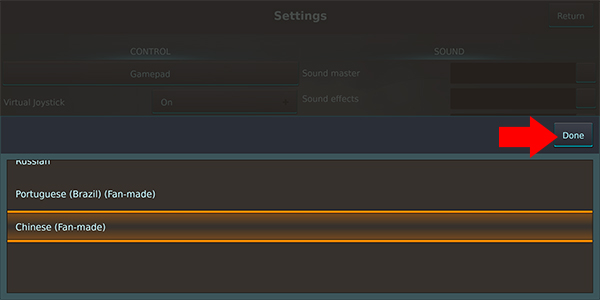 3、把它修改为Chinese之后,我们点击右上方的Done按钮来保存设置,接着关闭并重新启动游戏,这样就能将游戏改为简体中文。