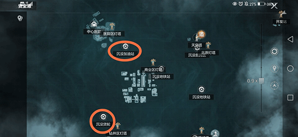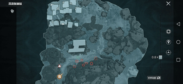 在下方这张图里,红圈所标注之处,便是沉没加油站中花岗岩的刷新地点。(需注意,绿圈标注处为气泡海鞘的所在位置)基于各刷新点之间的距离、往返路程以及物资刷新时间等因素,在此我向各位净化者提议,可按照以下路线来进行挖矿。