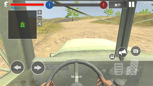 9、处于载具驾驶状态时,可通过左右箭头操控方向,右侧区域左边是刹车键、右边是油门键,另外还有个性化鸣笛与拍照功能按钮,若需下车,点击上方的“离开”选项即可。