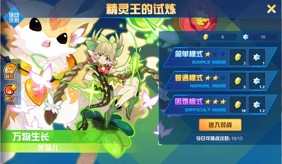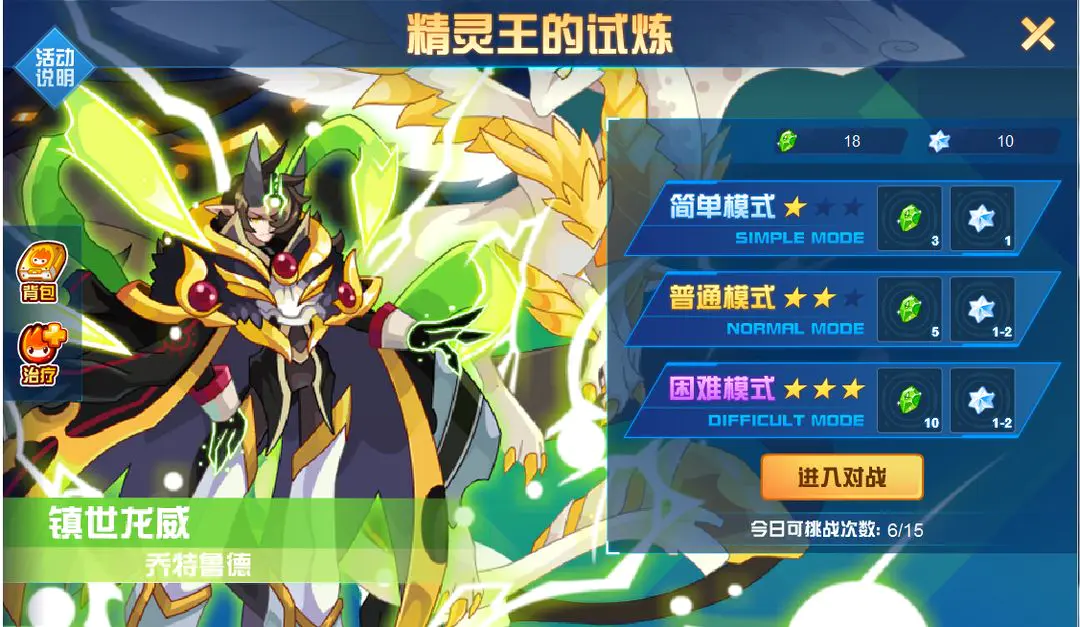 “精灵王的试炼”是游戏里重要的PVE玩法,各精灵王的试炼分为简单、中等、困难三个难度,分别掉落3、5、10个晶石;每周每个精灵王都会在指定日期掉落UP,各难度晶石掉落增加至8、10、15个。