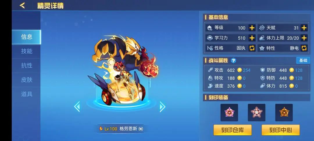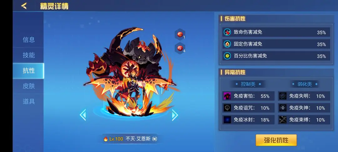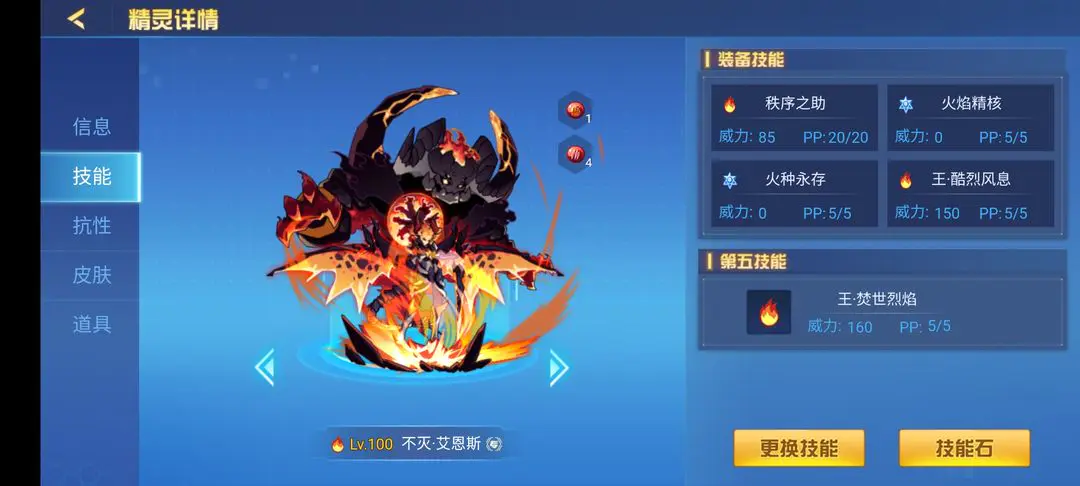 火王艾恩斯堪称赛尔号里相当离谱的一只精灵,也算是策划17年来设计出的“不带脑子”精灵代表之一。它自身有着高红伤、高粉伤和强控场能力,两条命的生存保障再加上“火种永存”的控场机制,哪怕只是靠着触发火种效果,都能压制住大部分冷门精灵。 关于配置搭配,我推荐在“火种永存”和150威力技能上各装一颗麻痹或疲惫宝石,这样在敌方水王登场,或是星皇切换出来的回合,往往能打出意想不到的效果。特性方面优先选瞬杀和毒特性;刷法建议攻体流,爆速玩法对非土豪玩家不太友好,这里不推荐。抗性的话,我个人建议刷害怕抗性——主要针对索兰森、猎皇和万魔天尊:前两位的威胁不用多说,最后这位可是2020年新出的“带恶人”精灵,不过有害怕抗性的火王完全能压制住它。套装方面,毒液、笑傲、腐蚀这几套都很合适。