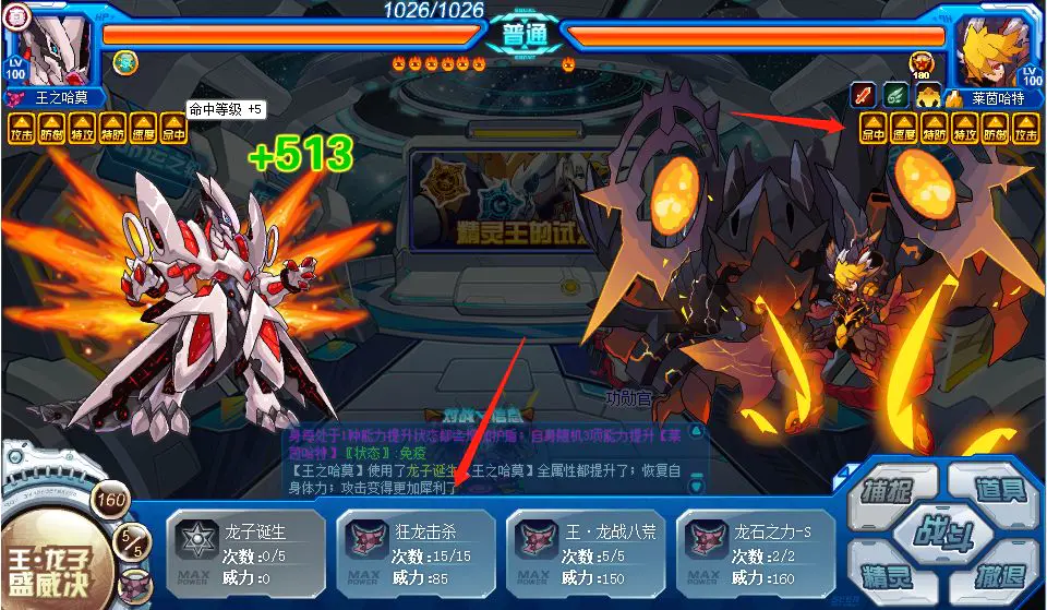 “龙子诞生”不仅能将对战中的王之哈莫进行属性上的提升,而且还有体力恢复的效果。所以大家可以放心使用该技能,待属性强化至五级以后,配合上第五技能“王·龙子盛威决”即可将精灵王们击败。