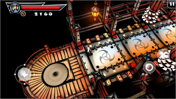8、在前进的道路上会有旋转的切割机,这个其实以前的关卡也曾经有过的。通过切割器的旋转间隙我们翻滚到中间的位置,之后也是用这样的方法不断的前进。