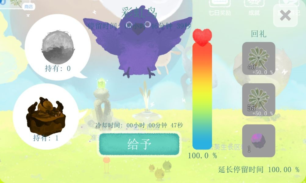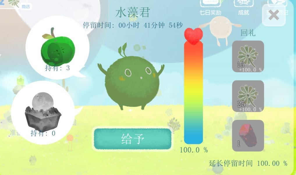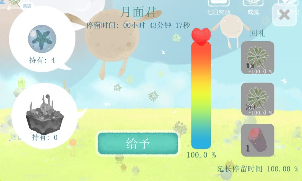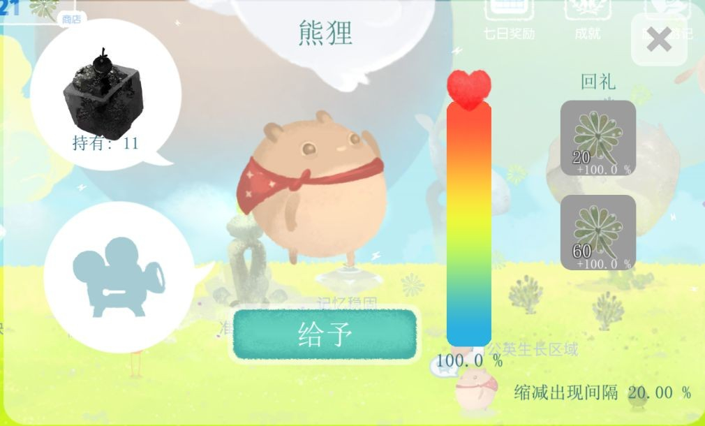 熊狸,手信①在暗图获得,满级会缩减20%出现间隔。这些动物满级后回礼都是有加成的,我们以熊狸为例,手信①回礼20,加成100%,满级后最终获得就是40蒲公英。