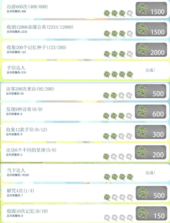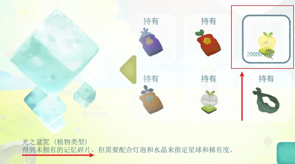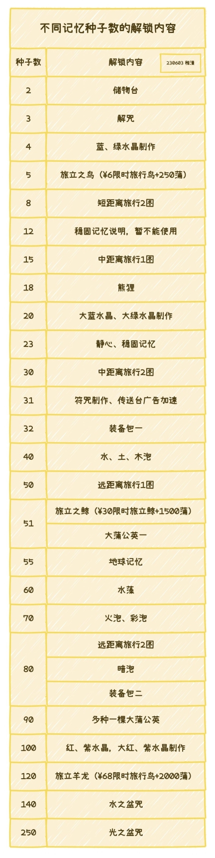 大概收集到250个记忆碎片(具体数量记不清了,当时没留意)就能解锁光之盆咒,用这个可以必出未拥有的碎片!不过得花2万蒲公英。建议大家直接等光之盆咒就行,别像我一样当大冤种去买水之盆咒——收集党要是实在想买,也可以等以后蒲公英足够多了再说。我也是刚玩第二天,踩了好多坑,先是买了鲸鱼,接着又买了水盆= =,把这些经历发出来给大家避避雷。
