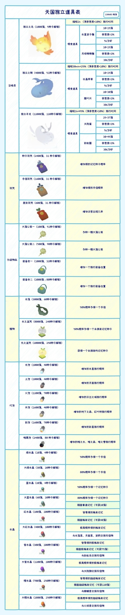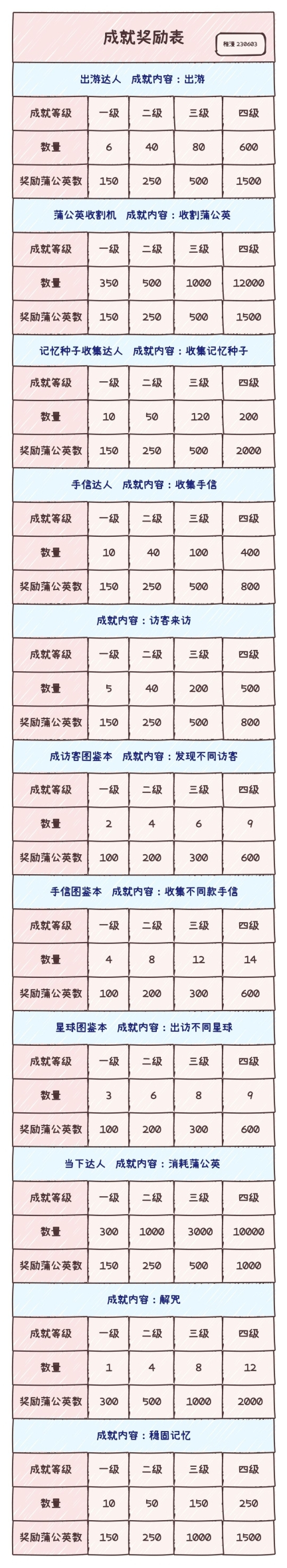 目前已完成道具、访客、旅行点、成就奖励、种子数与解锁内容表格。