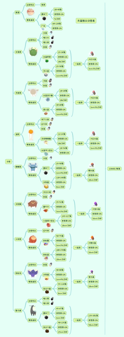 可与访客交换的道具,已标成相同颜色,蝾螈君与彩虹鸟已单独列明。