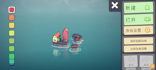 2、点击右上角的齿轮图标打开设置菜单,选择新建选项,即可开始在水面上建造房屋;