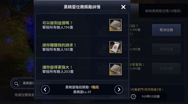 从黑精灵任务点击黑精灵任务奖励详情,可以确认黑精灵各阶段的任务目标和奖励。