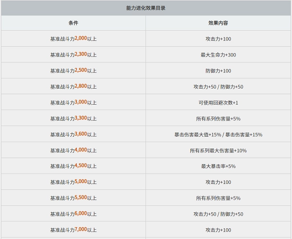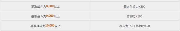 - 按照角色的基准战斗力,达成特定战斗力时可以额外获得增益效果。