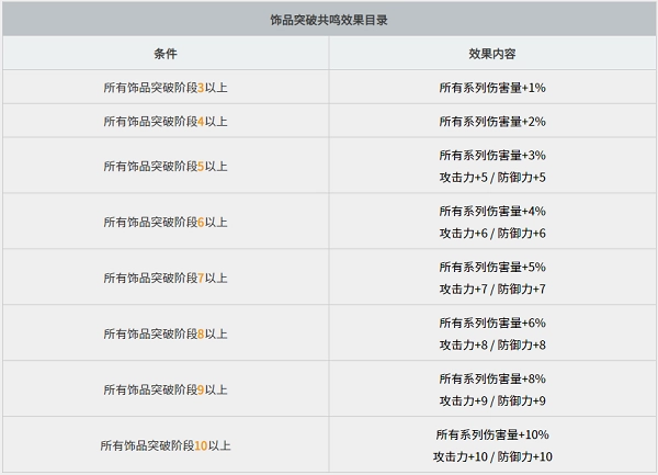 - 按照穿戴的饰品的突破阶段及等级,可额外获得增益效果。