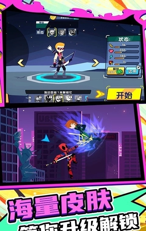 3、解锁角色皮肤提升属性挑战多关卡获取丰厚奖励。