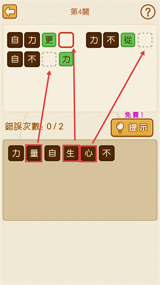 3、进入第4关成语填空关卡,把【量】【生】【心】这三个字填到对应的位置,补全“自力更生”“力不从心”“自不量力”这三个成语,要是有困难可以借助提示来帮忙完成。