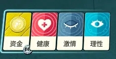 看到这三个属性了吗?你前期的任务之一就是增加这些卡牌的数量,尤其要注意理性——至少得有两张理性卡牌,才能保证你能赚到钱、顺利活下去。提升这三项属性的优先级永远是理性排在最前面,健康和激情则不分先后(毕竟在这个世界里,笨蛋是没法生存的)。