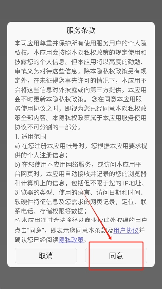 1、仔细阅读服务条款内容后,点击“同意”按钮,以此表示您接受该条款并可继续后续操作。