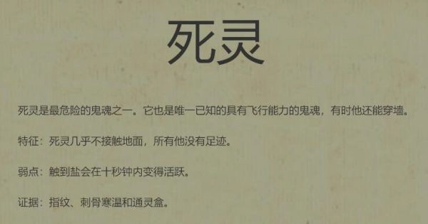 例:死灵的三个证据为:指纹、刺骨寒温、通灵盒,同时死灵的特征是可以穿墙并且没有脚印。