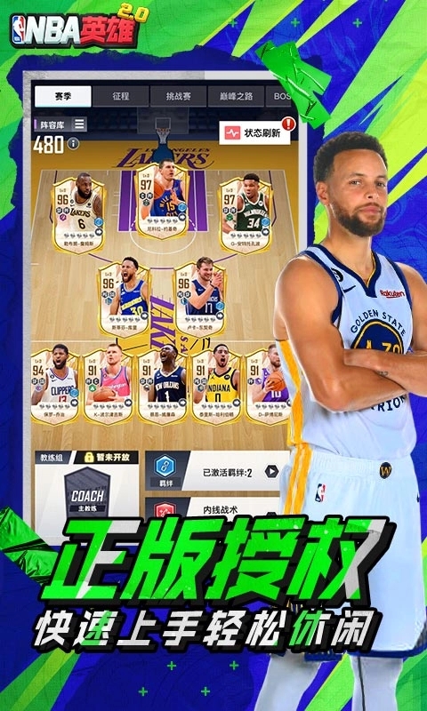 玩家扮演球队经理+主教练,需要收集球员卡牌、安排阵容、制定战术。阵容共5个位置(PG控卫、SG分卫、SF小前、PF大前、C中锋),另有3个替补席。球员有“稀有度”(白/绿/蓝/紫/橙/红)和“战力值”。搭配时需考虑“化学反应”:同队球员(如勇士四巨头)有属性加成,同位置球员(如双塔)有特殊组合技。